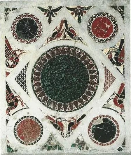 Geometric Cosmatesque Panel - A marble slab is inlaid with interlocking circles and triangular fields organized around a central disk. The design is composed of colored stone and glass tesserae set into white marble, creating a balanced geometric composition characteristic of Cosmatesque decoration.