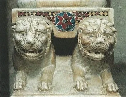 Lectern Base with Lions - A marble lectern base is supported by two carved lions positioned side by side. A lectern is a stand used to hold liturgical books for reading. The animals function as both structural supports and symbolic guardians within the church furnishing.