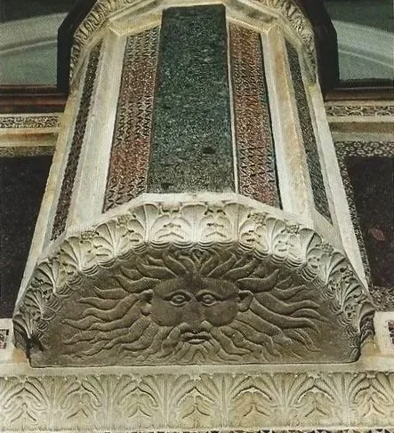 Underside Support with Mask - The image shows the underside of a projecting marble element viewed from below. At the center, a carved mask with radiating hair or solar features occupies the base of the support block. The surrounding surfaces are bordered with Cosmatesque geometric inlay composed of colored stone and glass tesserae. The mask functions as a decorative termination at the structural base of the projecting element rather than as a frontal panel.